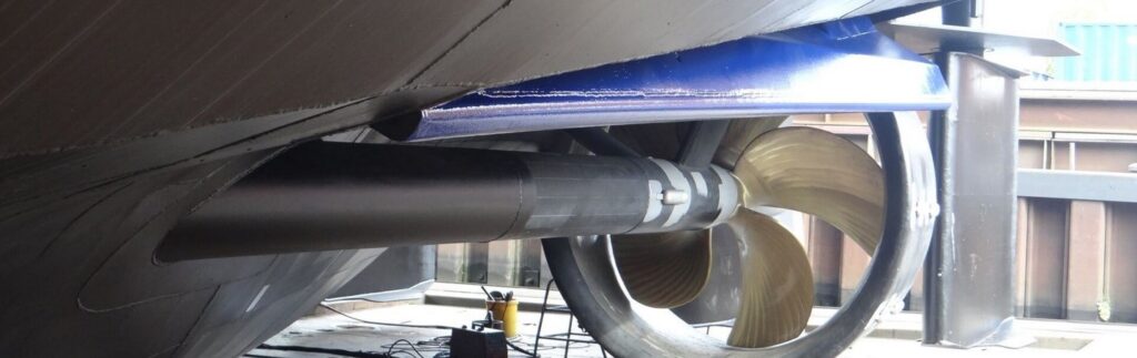 Die »Rhenus Duisburg« glänzt mit einer weiteren Innovation. Am glatt gezeichneten Hinterschiff wurden zwei Propeller mit jeweils 2 m Durchmesser angebracht, düsenummantelt und mit Spoiler angebracht – die größten ihrer Art für Motorgüterschiffe. Vorteil: Während der voll abgeladenen Rheinfahrt werden die Propeller von ausreichend Wasser umströmt und entfalten vollen Schub.