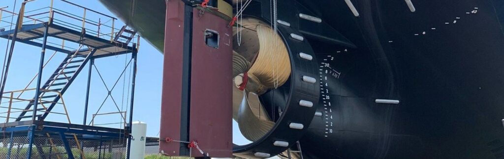 Here we have our open linkage flap rudder being installed under a 7.000 DWT cargo vessel. The photos show a part of the installation process where the rudder stock is assembled through the steering gear deck and subsequently fixed to the front end of the rudder blade. Depending on the size and weight of the rudder, it is a relatively fast process, yet it must be performed with utmost precision to ensure a correct assembly of the rudder and steering gear.  Our Timon rudder has an open linkage flap mechanism and a side bar system, which allows for a total rudder angle of 90°.